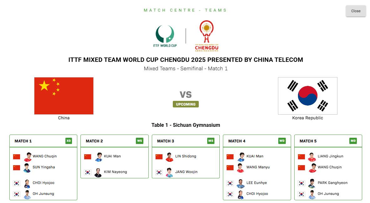 国外乒联混团寰宇杯半决赛 中国对阵韩国名单出炉
